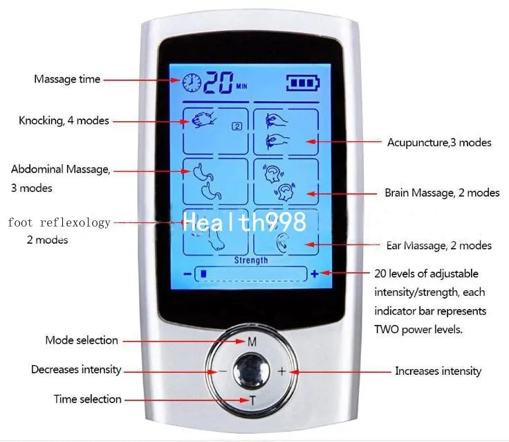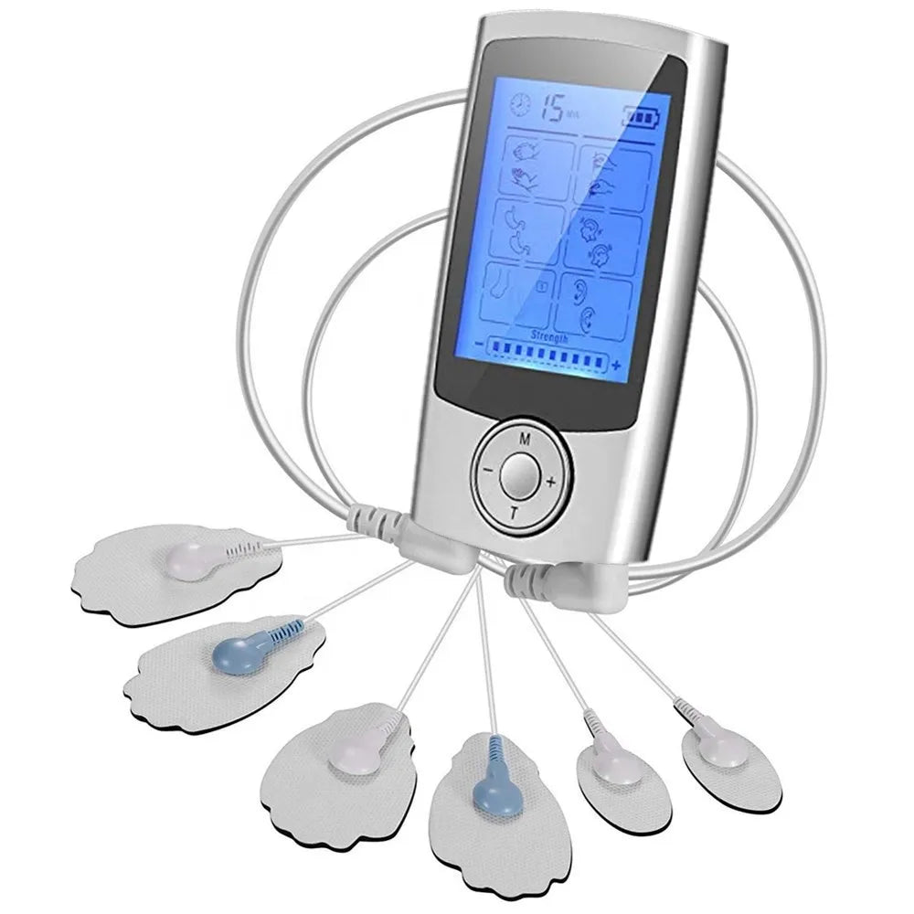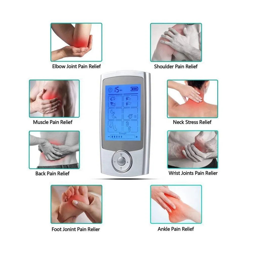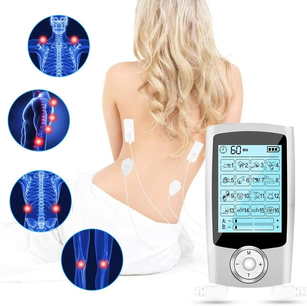 Relieve pain instantly and naturally with this advanced 16 Mode Digital EMS TENS Massager! Combining Traditional Chinese Meridian therapy with modern microelectronic pulses, it sends gentle bioelectrical waves to nerves and muscles to ease tension, improve circulation, and promote healing. Perfect for shoulder, back, waist, knee, leg, and foot pain — ideal for office workers, drivers, or anyone with chronic discomfort. Features dual output (massage 2 areas at once), large LCD display, 10 to 60 minute timer, and 16 professional modes including acupuncture, shiatsu, kneading, cupping, and more.