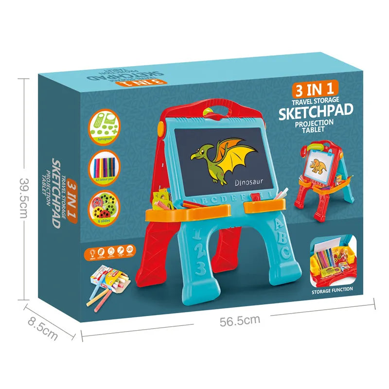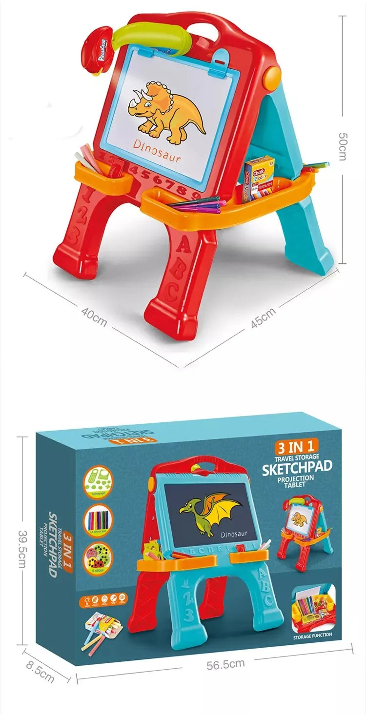 Ignite your child's artistic talent with the 3 in 1 Drawing Projector Tablet, a versatile creative station for kids aged 3 and up. This all-in-one set combines a projector for tracing images, a chalk blackboard, and an erasable whiteboard with a 60-page drawing book (29.7 x 42 cm). Made from durable, child-safe materials, it includes pastel pencils, chalk, and accessories for endless drawing, coloring, and learning fun. The projector displays patterns to trace, while dual boards allow free expression with chalk or dry-erase markers. Perfect for developing fine motor skills, hand-eye coordination, and imagination through multisensory play.
