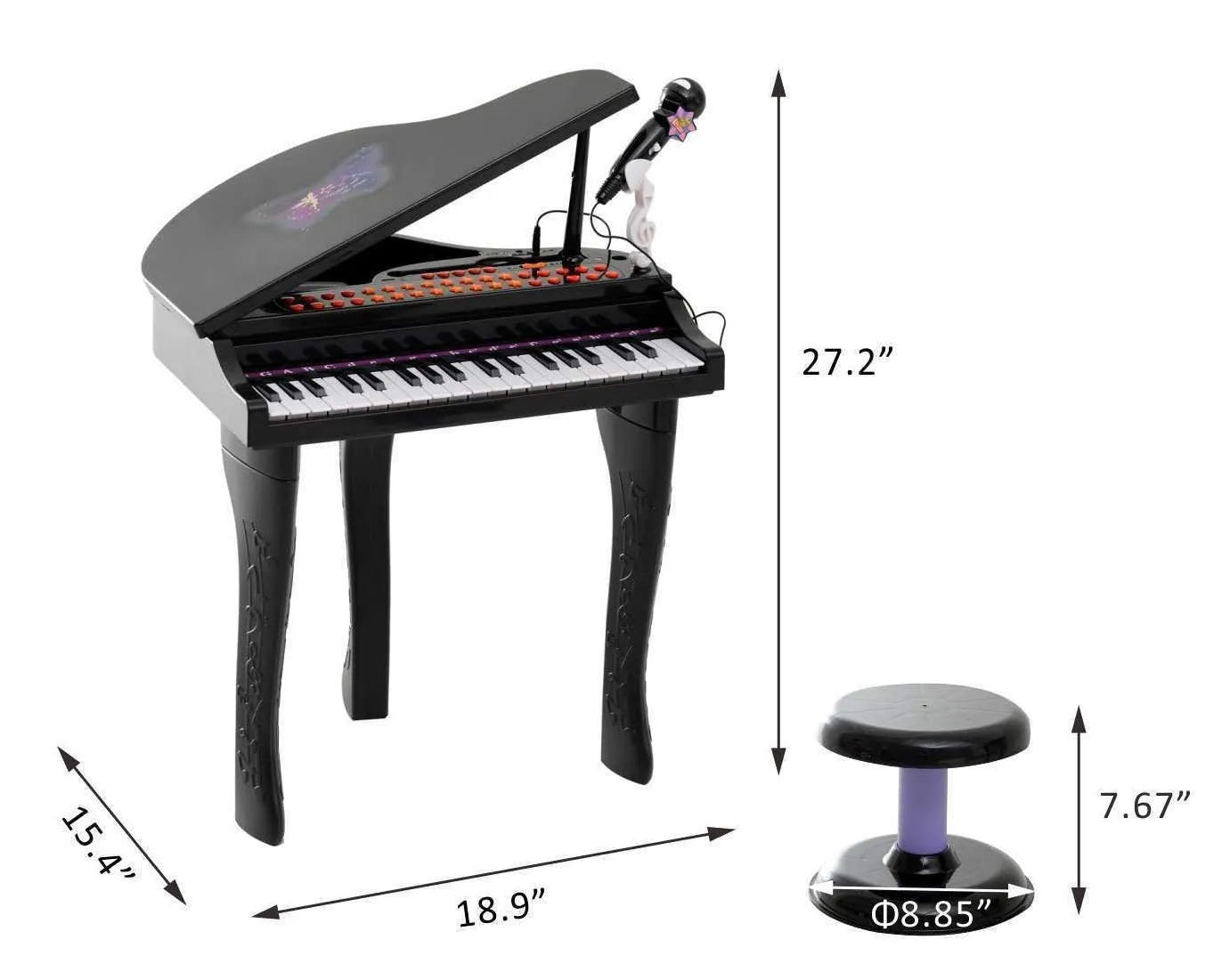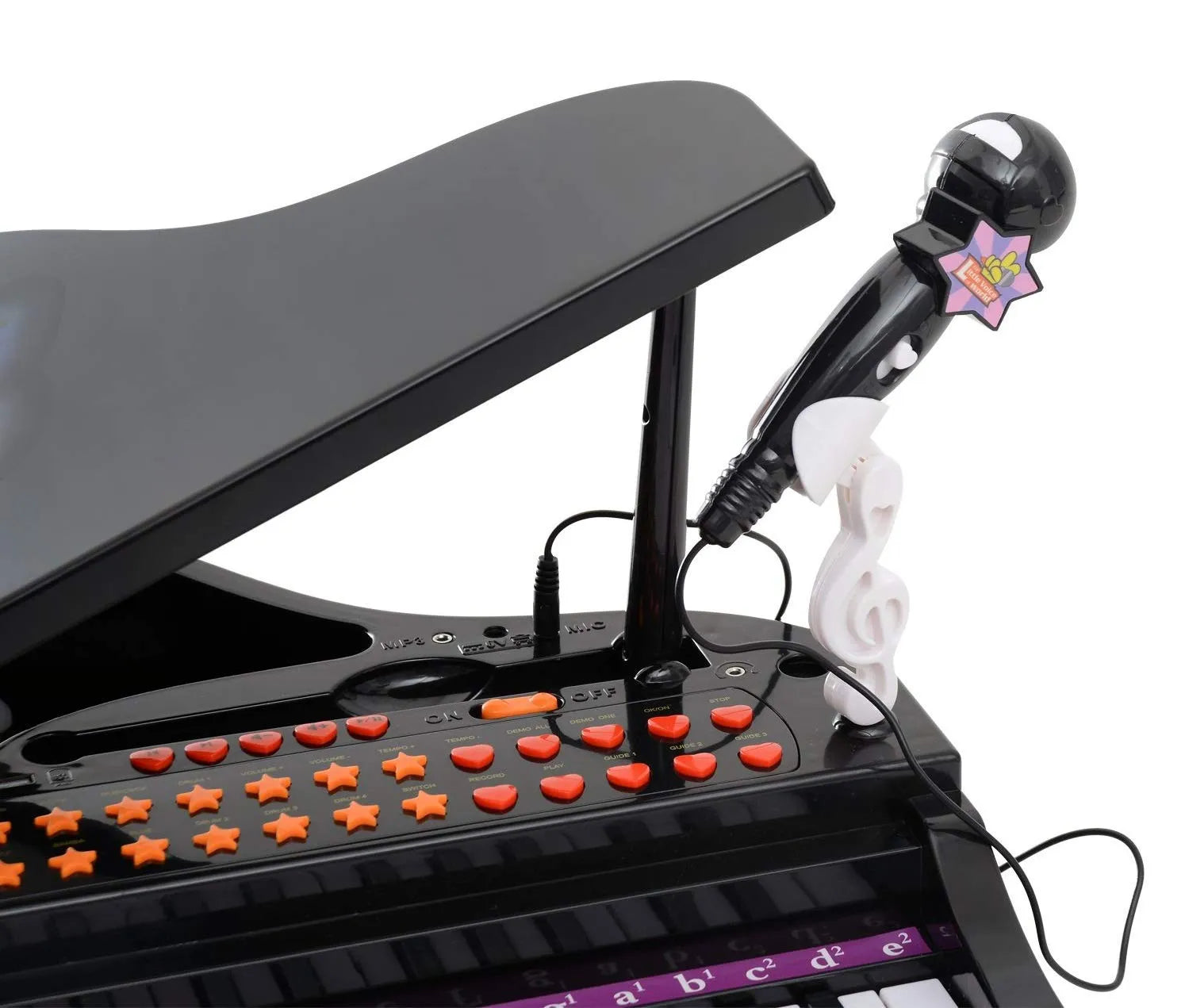 Inspire your child's musical talent with the 37 Keys Electric Musical Piano, a feature-rich keyboard designed for aspiring young musicians aged 4 and up. This elegant black piano mimics the look and feel of a real grand piano in a compact, kid-friendly size (48 x 39.5 x 68.5 cm). It includes 37 electronically tuned keys, a detachable sing-along microphone, and a matching stool for comfortable seated or standing play. With built-in educational mode featuring flashing red guide lights, multi-function controls (record, playback, MP3, karaoke), and auto-sleep functionality, this piano supports learning and creativity. Perfect as a birthday or holiday gift, it fosters rhythm, coordination, and confidence through interactive musical play.