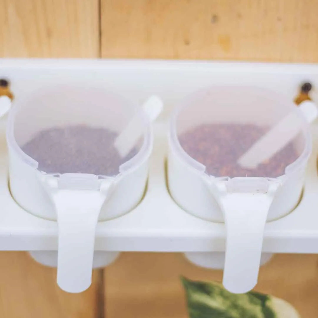 Available in random neutral colors to blend seamlessly with any kitchen interior, the rack is lightweight, easy to install on walls or cabinets, and simple to refill. Each container has an easy-open flick lid and comes with a complimentary spoon for mess-free measuring and pouring. Made from high-quality sturdy plastic, it is durable, resistant to breakage, and effortless to clean.