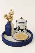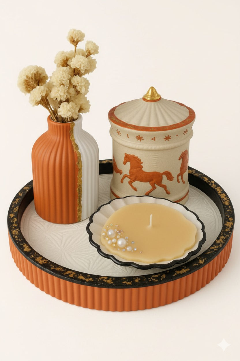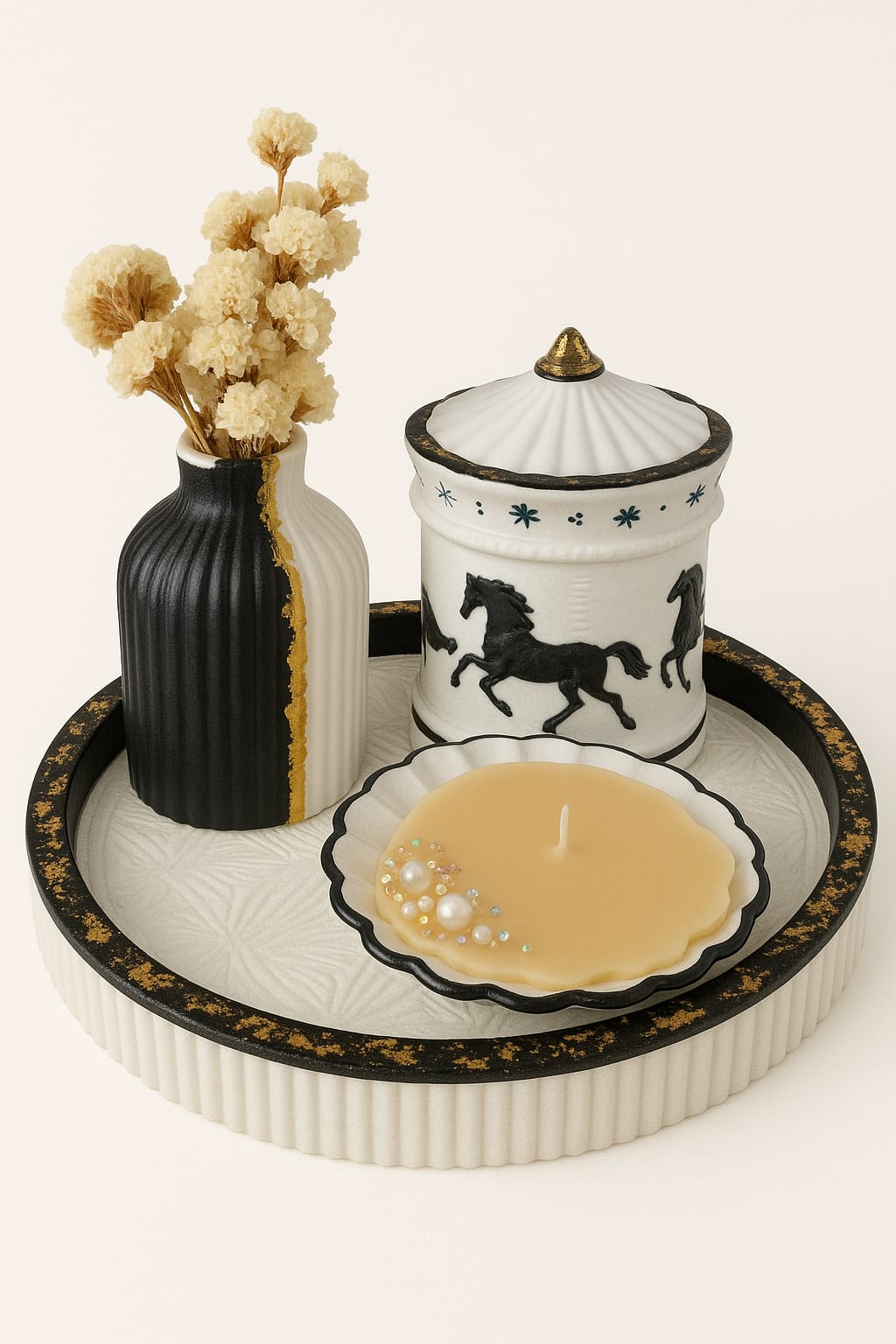 4-Piece Set – Includes round tray, dual-tone vase with dried flowers, horse-design lidded jar, and scalloped candle bowl.
