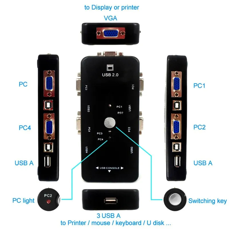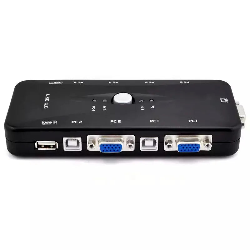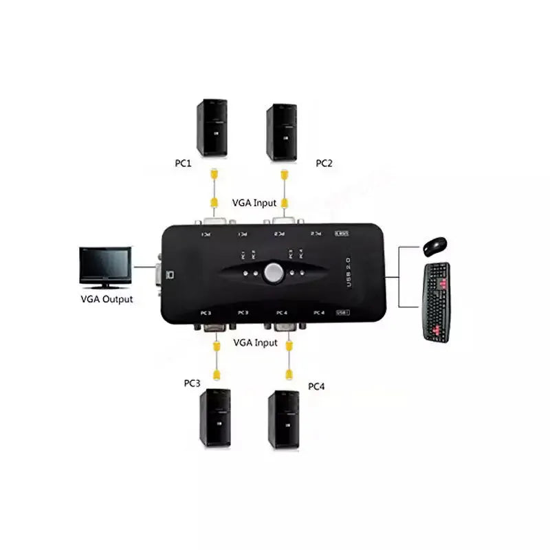 Streamline your workspace with the 4 Port USB 2.0 KVM Switch Box Universal Adapter, designed to control up to four USB-enabled computers using a single keyboard, mouse, and VGA monitor. This compact and durable switch, crafted from high-quality ABS material, offers seamless switching through hotkey commands or top-panel push buttons, making it an efficient and economical solution for desktop management. Ideal for IT professionals, home offices, or multi-device setups, this KVM switch maximizes space and enhances productivity with reliable performance and USB 2.0 compatibility.