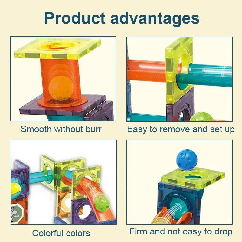 Advanced Magnetic Construction Technology Children can easily connect the durable ABS plastic pieces using powerful magnetic connections to create thrilling marble mazes. Each piece features reinforced magnets with superior sealing performance achieved through ultrasonic welding technology. The robust construction ensures long lasting play value while maintaining compatibility with other major magnetic building block brands.