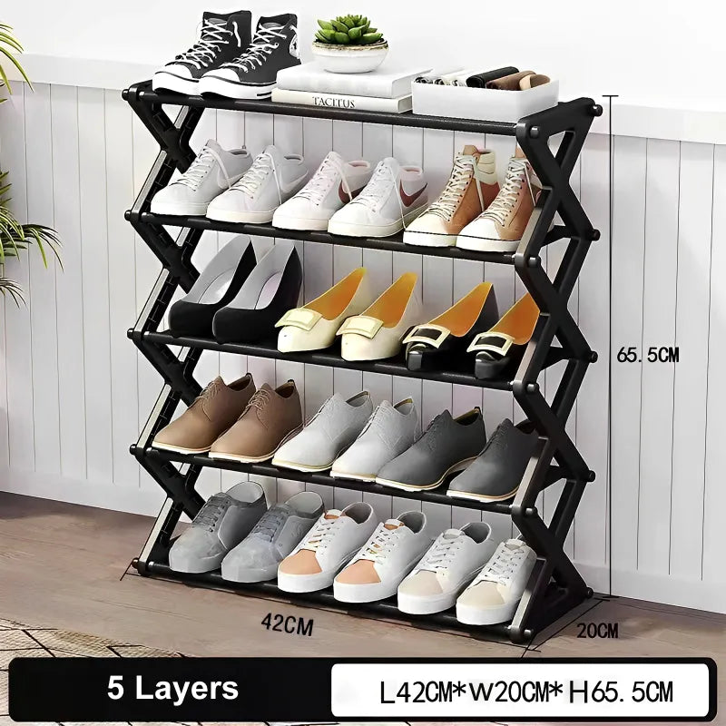 Maximize your shoe storage with the 5 Layer X-Type Foldable Fashion Shoe Organizer Stand, a stylish and space-saving solution perfect for bedrooms, entryways, closets, apartments, and dorms. This modern shoe rack features five spacious layers designed to hold multiple pairs of shoes, including sneakers, heels, sandals, flats, and low boots, keeping your collection neatly organized and easily accessible.