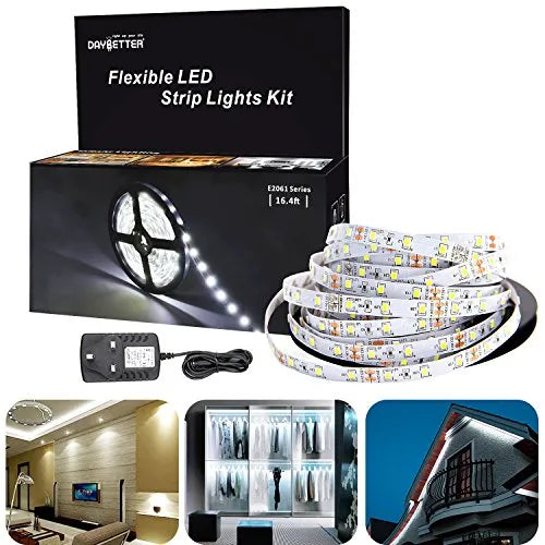 Transform any space with the 5M 3528 SMD LED Strip Light Kit (300 LEDs, Pure White) — a bright, energy-efficient lighting solution perfect for bedroom ambiance, TV backlighting, kitchen under-cabinet, or ceiling cove illumination. Delivering 900 lumens of crisp pure white light with 120° beam angle, this flexible 12V strip is cuttable every 3 LEDs and comes with adhesive backing for easy installation. Extremely low heat, safe to touch, and rated for 50,000+ hours lifespan. Includes power adapter and mounting clips. Non-waterproof — ideal for indoor dry areas. Note: Product is currently out of stock.