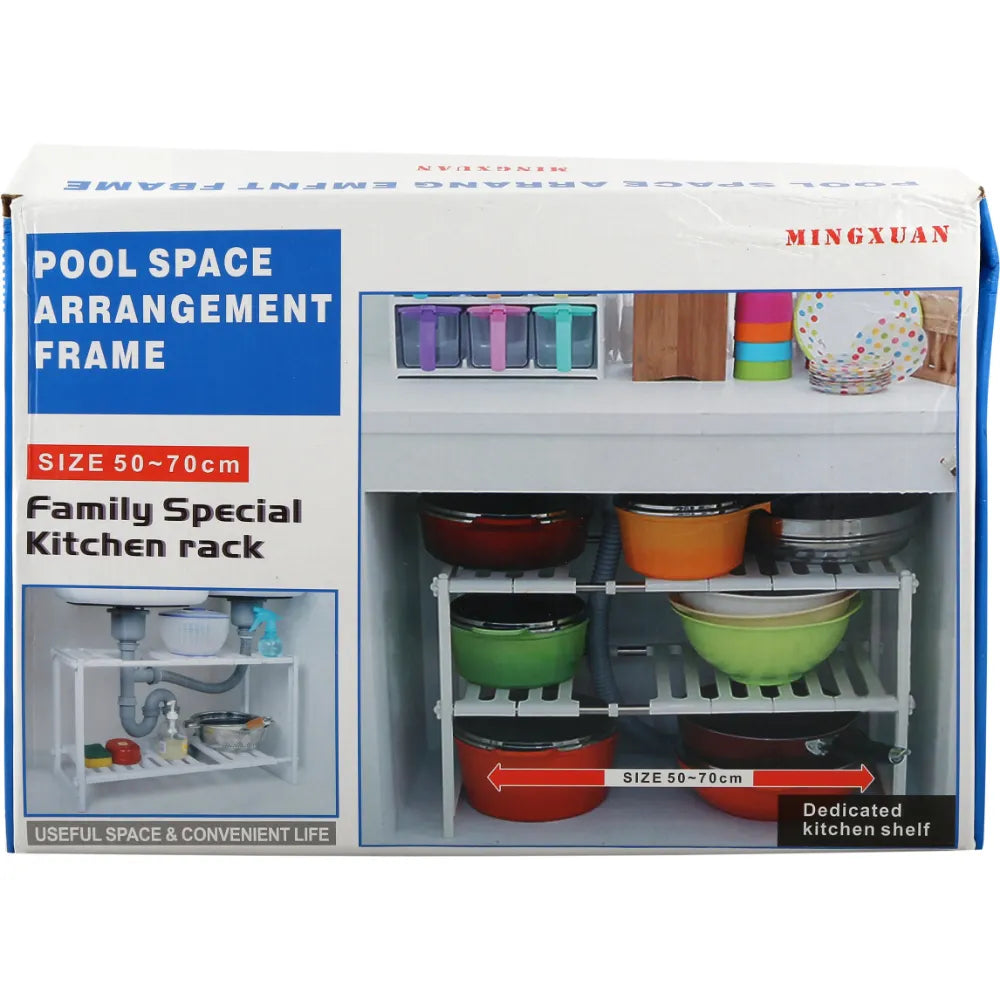 Perfect for family kitchens, this adjustable rack transforms cluttered under-sink spaces into organized, accessible storage areas, making it a must-have for efficient kitchen management.