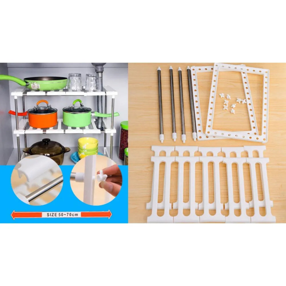 Maximize your kitchen storage with the Adjustable Under Sink Kitchen Storage Rack, a versatile and durable solution designed to organize your under-sink area. Crafted from high-quality ABS plastic and stainless steel, this free-standing rack adapts to various pipe configurations, offering customizable shelving for cleaning supplies, toiletries, and more. Its modular design and tool-free installation make it an ideal space-saving addition to any kitchen, providing easy access and a clutter-free environment.