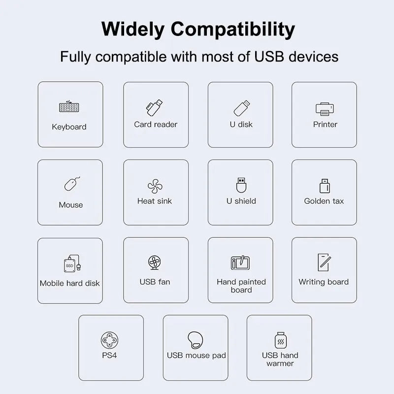 Versatile Compatibility: Supports a wide range of devices, including notebooks, card readers, hard disks, USB fans, and more (max output current 900mA; external power adapter required for some high-power HDDs).