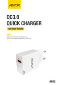 Power up your devices swiftly and safely with the Aspor A822 PD+QC3.0 18W Fast Charger. Designed for efficiency, this white wall charger features a single USB port with Power Delivery (PD) and Quick Charge 3.0 (QC3.0) technology, delivering up to 18W of power for rapid charging of mobile phones and other compatible devices. Equipped with an intelligent main control chip, it optimizes current distribution for safe, battery-friendly charging. Built with premium materials like pure copper and an advanced cooling system, this charger ensures durability, high conductivity, and excellent heat dissipation for reliable performance.