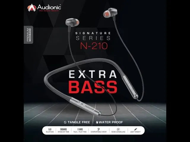 Experience unparalleled audio with the Audionic Signature N-210 Premium Wireless Bluetooth Neckband. Powered by the advanced Qualcomm QCC 3003-V5.0 chipset, this black neckband delivers superior sound quality, noise cancellation, and a tangle-free, waterproof design. With Bluetooth 5.0, it ensures seamless connectivity within a 10-meter range. The 110mAh battery provides up to 11 hours of talk or play time and an impressive 300 hours of standby, with a quick 1-hour charge. Lightweight and comfortable, this neckband is perfect for workouts, travel, or daily use.