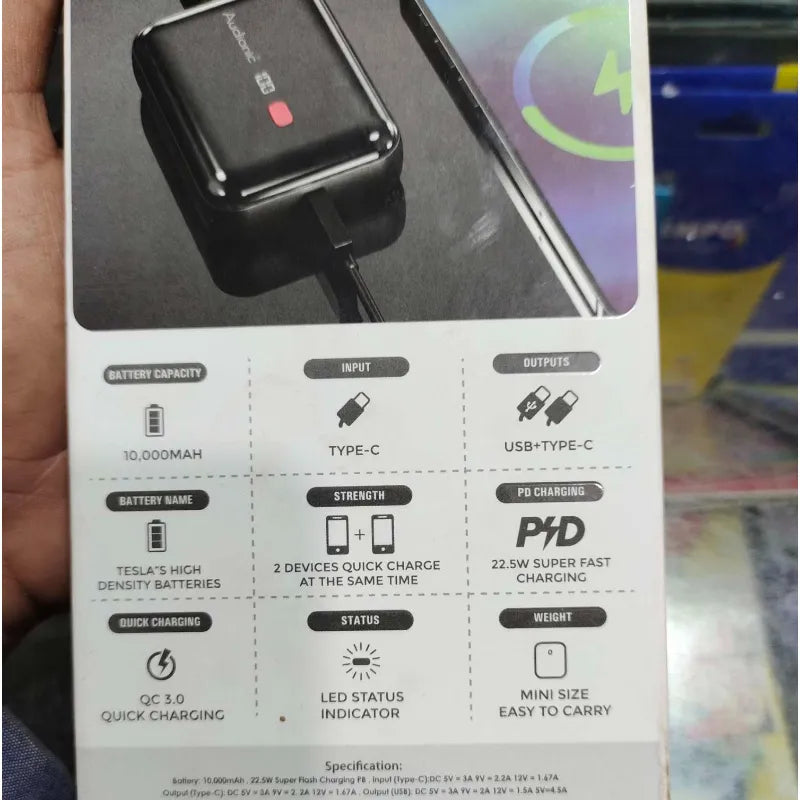 Stay powered up with the Audionic Tesla T-10 Power Bank, a high-performance 10000mAh charger designed for universal compatibility and super-fast charging. Featuring advanced 22.5W QC 3.0 technology, this sleek black power bank can charge two devices simultaneously via USB and Type-C outputs. Its compact, travel-friendly design and lightweight 400g build make it ideal for on-the-go use, whether for daily commutes or emergencies. Equipped with a digital LED display for real-time battery status, the Tesla T-10 combines cutting-edge technology with convenience, making it a must-have mobile accessory for modern lifestyles.
