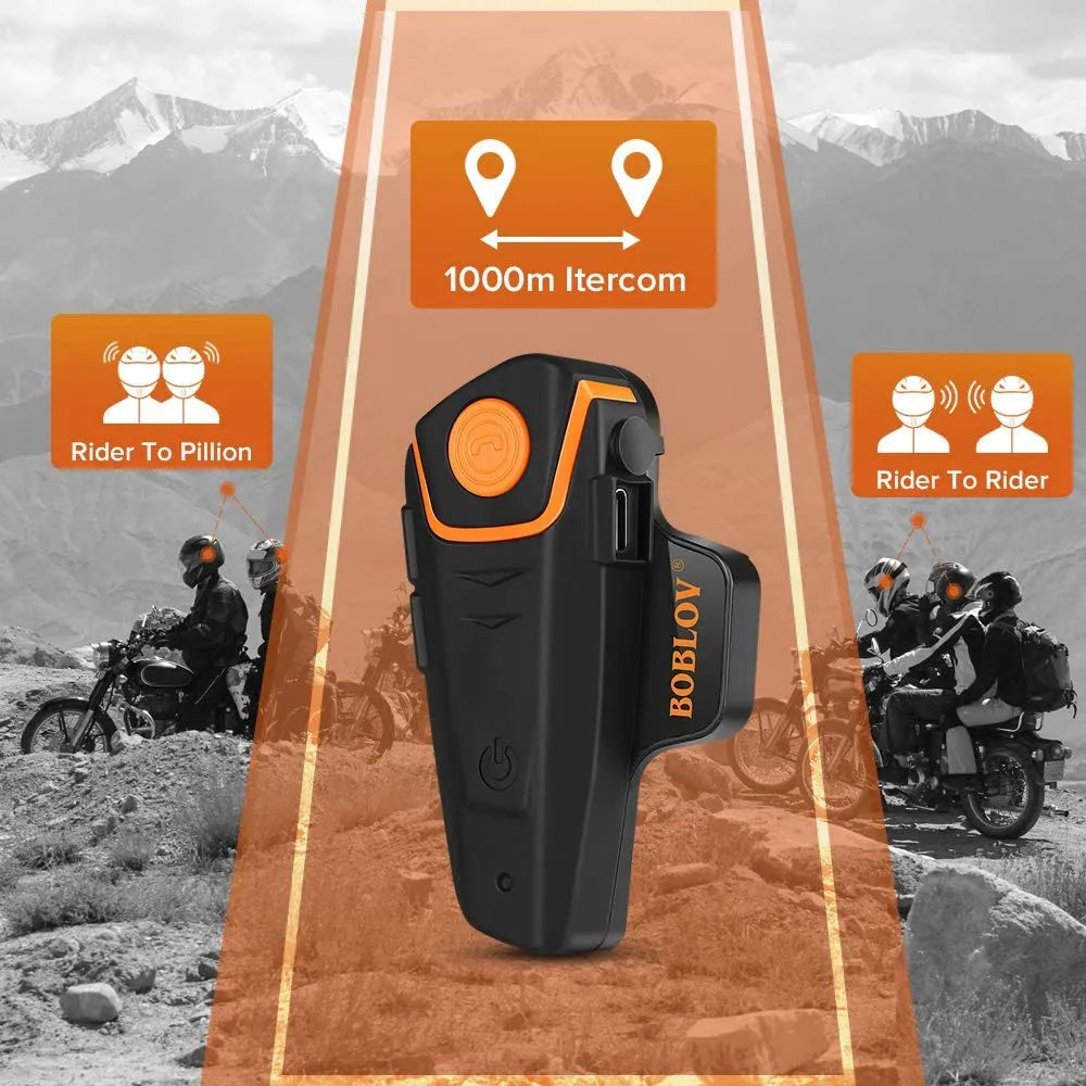 Ride connected and safe with the BOBLOV BT-S2 1000m Motorcycle Helmet Intercom — the ultimate Bluetooth headset for bikers! Enjoy crystal-clear full-duplex communication up to 1000 meters between 2 riders, hands-free phone calls, GPS navigation, and your favorite music with DSP wind-noise cancellation. Fully waterproof (IP67), it works perfectly in rain or shine and supports speeds up to 120 km/h. Easy glove-friendly buttons, universal fit for full-face and half-face helmets, plus built-in FM radio — everything you need for long rides and group touring.