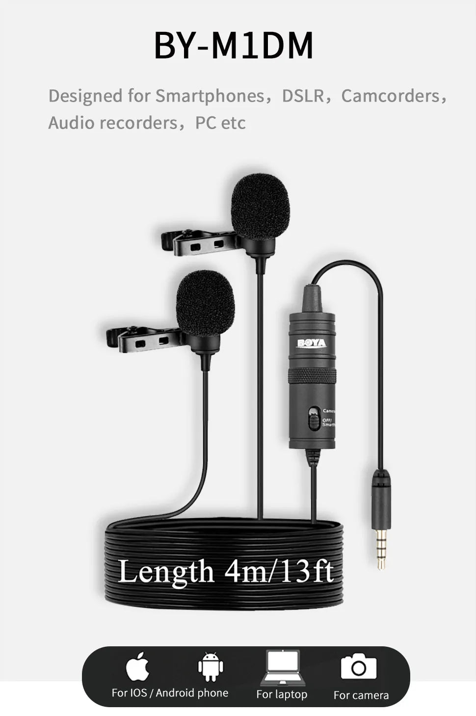 Dual-Head 3.5mm TRRS Condenser Lavalier Microphone for PC and Mobile Black 4m Cable