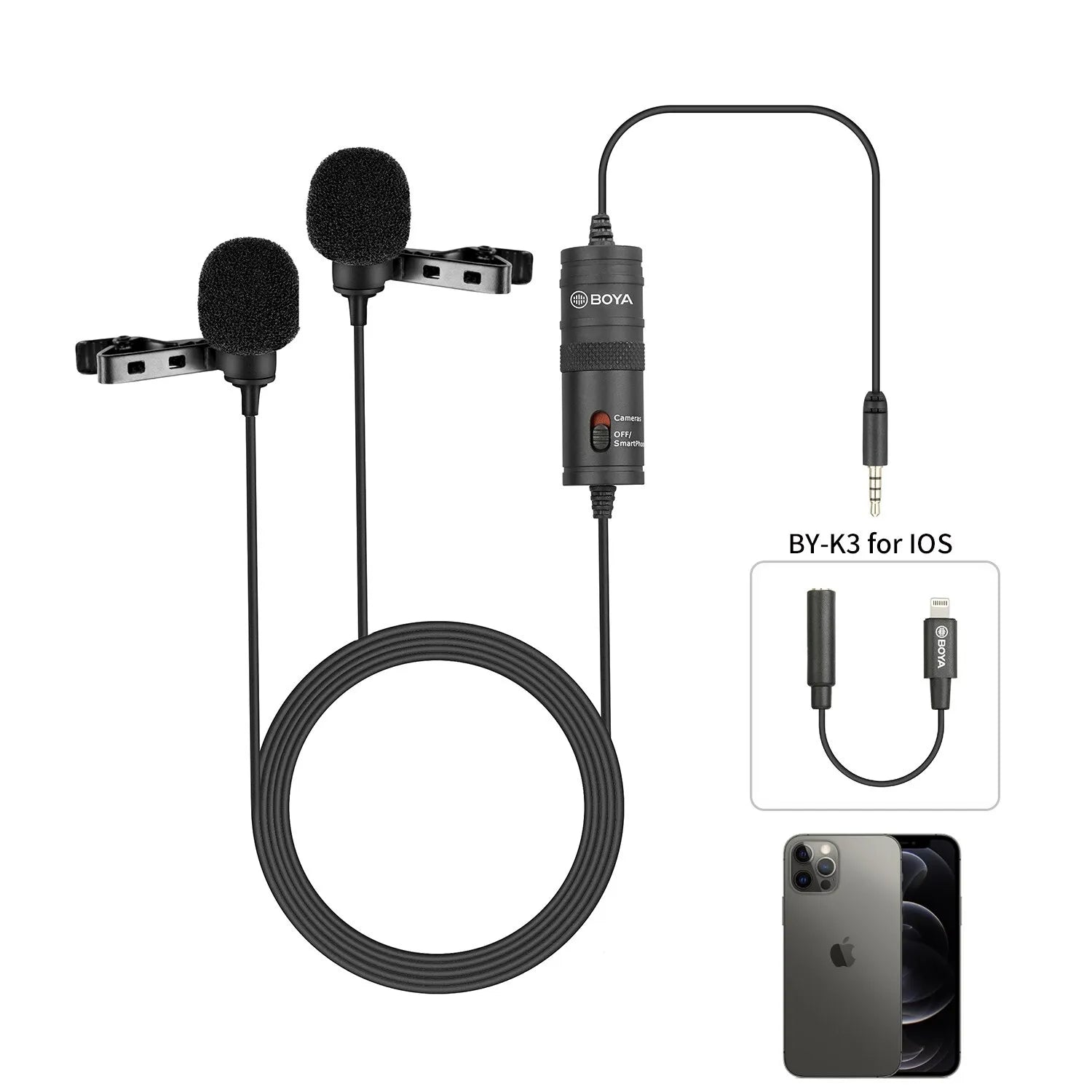 Capture professional-grade audio with the Dual-Head 3.5mm TRRS Condenser Lavalier Microphone, designed for vloggers, podcasters, and interviewers. This black lavalier microphone features a 4m (13ft) cable and omni-directional polar pattern, ensuring clear, high-quality sound from multiple directions. Compatible with smartphones, PCs, DSLRs, and professional audio devices, it includes a 6.5mm adapter for versatile connectivity. With a clip-on design, foam windscreens, and a convenient carrying case, this microphone is perfect for on-the-go recording.