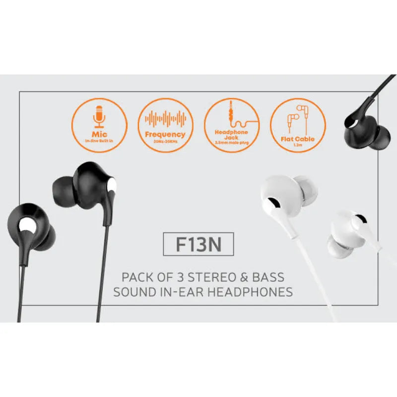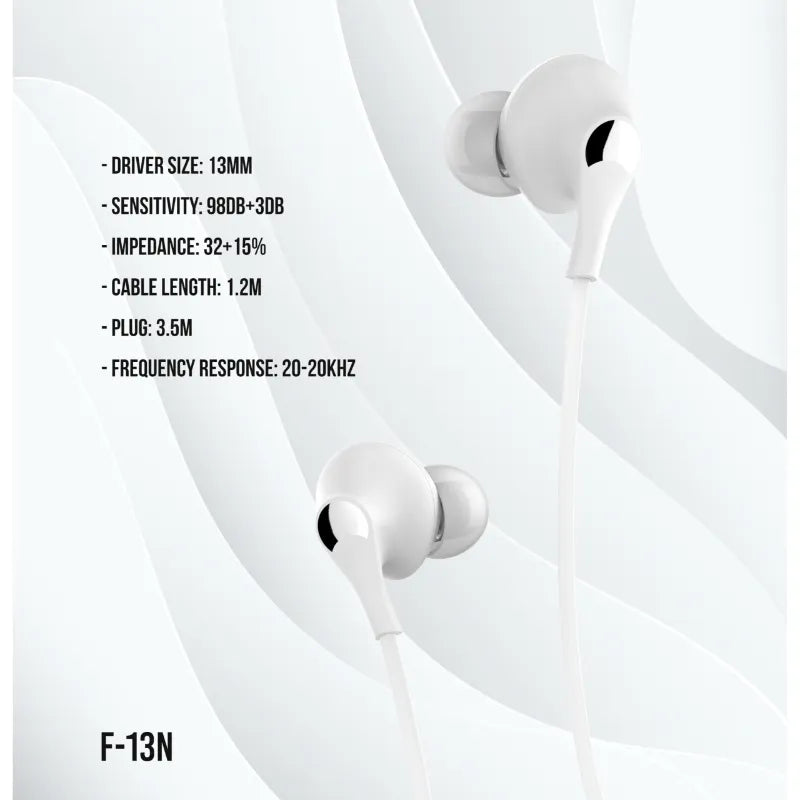 Immerse yourself in superior audio with the F13N Stereo In-Ear Headphones, crafted for music enthusiasts seeking rich bass and crystal-clear sound. These modern and fashionable in-ear earphones are designed for exceptional comfort and durability, making them perfect for daily commutes, workouts, or casual listening. Equipped with a high-quality in-line microphone, the F13N delivers both outstanding sound and seamless communication.