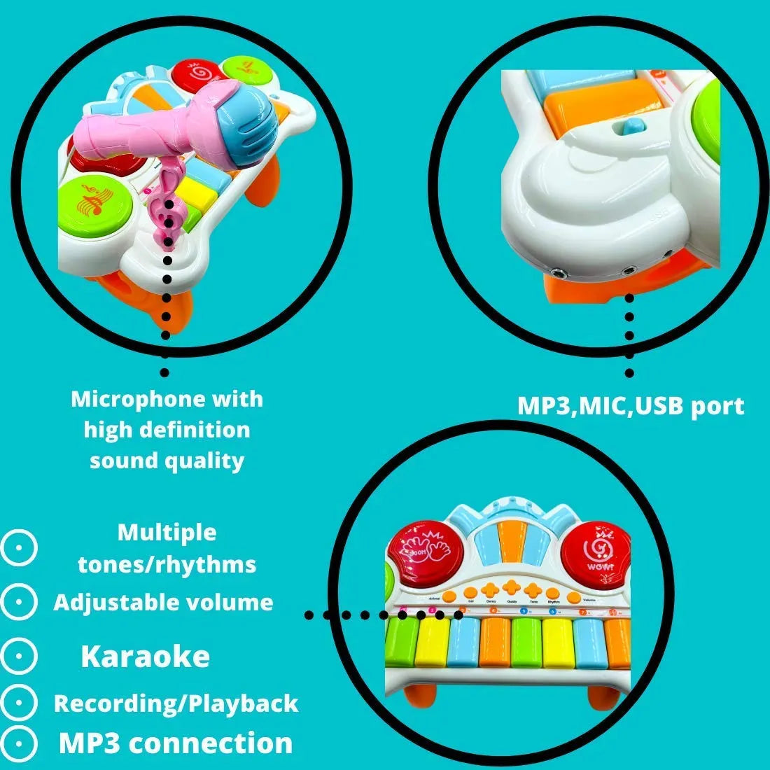 Multi-Functional Design: Offers various music modes, including animal and car sounds, rhythms, tones, and a mute option for versatile play.
