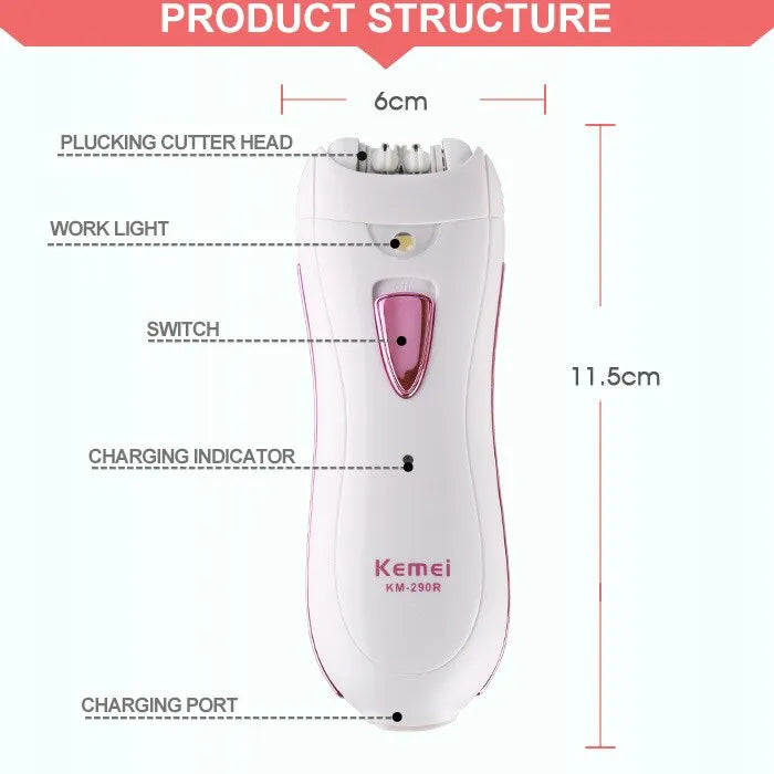 Featuring a universal voltage (100-240V) and up to 30 minutes of cordless use after an 8-10 hour charge, this epilator ensures convenience and flexibility. Its ergonomic handle provides a comfortable grip, while the advanced hair removal system captures even the finest hairs for a silky finish. For best results, trim hair to 4-5 cm before use. Ideal for women seeking a reliable, compact solution for facial and body hair removal, the Kemei KM-290R combines performance, portability, and ease of use.