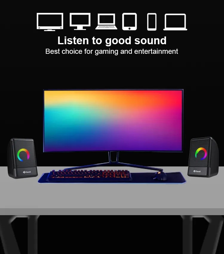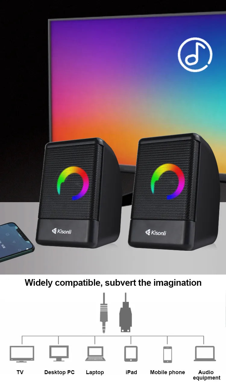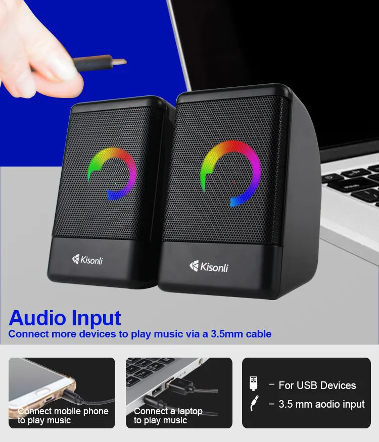 Experience vibrant audio with the Kisonli L-8080 Cool Music Box Portable USB Speakers, designed for music enthusiasts seeking quality sound from laptops, computers, and multiple devices. These compact 2.0 channel speakers deliver a robust 6W output (3W main + 3.3W x 2) with a frequency response of 90Hz–20kHz, ensuring clear and immersive audio for music, movies, or gaming. Crafted from durable ABS plastic with a sleek black finish and single-color LED lighting, the L-8080 combines style and portability. With USB power and AUX connectivity, these speakers are perfect for home, office, or stage use. Note: This product is currently out of stock.