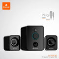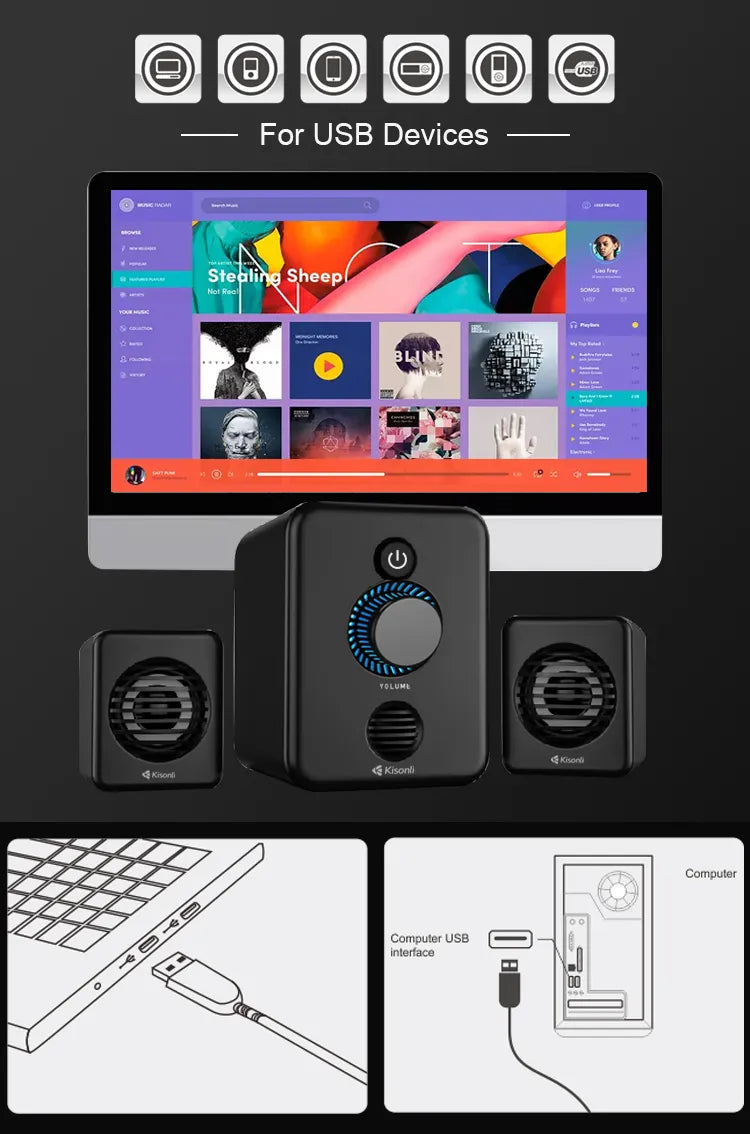 USB 2.1 Speaker System: Combines a main speaker (100 x 120 x 135 mm) and two side speakers (60 x 55 x 63 mm) for balanced audio.