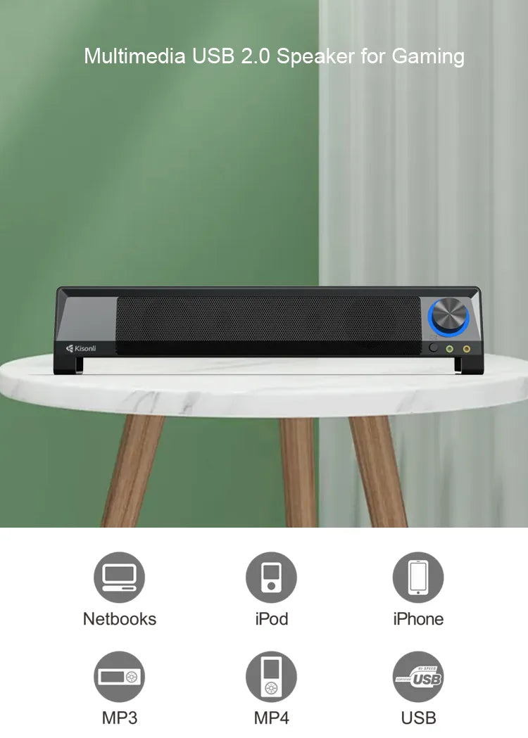 Enhance your audio experience with the Kisonli X2 Oblong Multimedia USB 2.0 Speaker, a sleek and powerful soundbar designed for computers and gaming setups. Featuring a modern bar format, this speaker delivers crisp, high-quality audio with 3W x 2 output (max 3.5W) and a wide frequency response of 30Hz–15kHz. Its compact, plastic cabinet design is accented with stylish blue light, making it a perfect addition to any desk or gaming station. With easy USB power and 3.5mm jack connectivity, the Kisonli X2 is compatible with a wide range of devices, including Windows, Mac, iOS, and Android. Note: This product is currently out of stock.