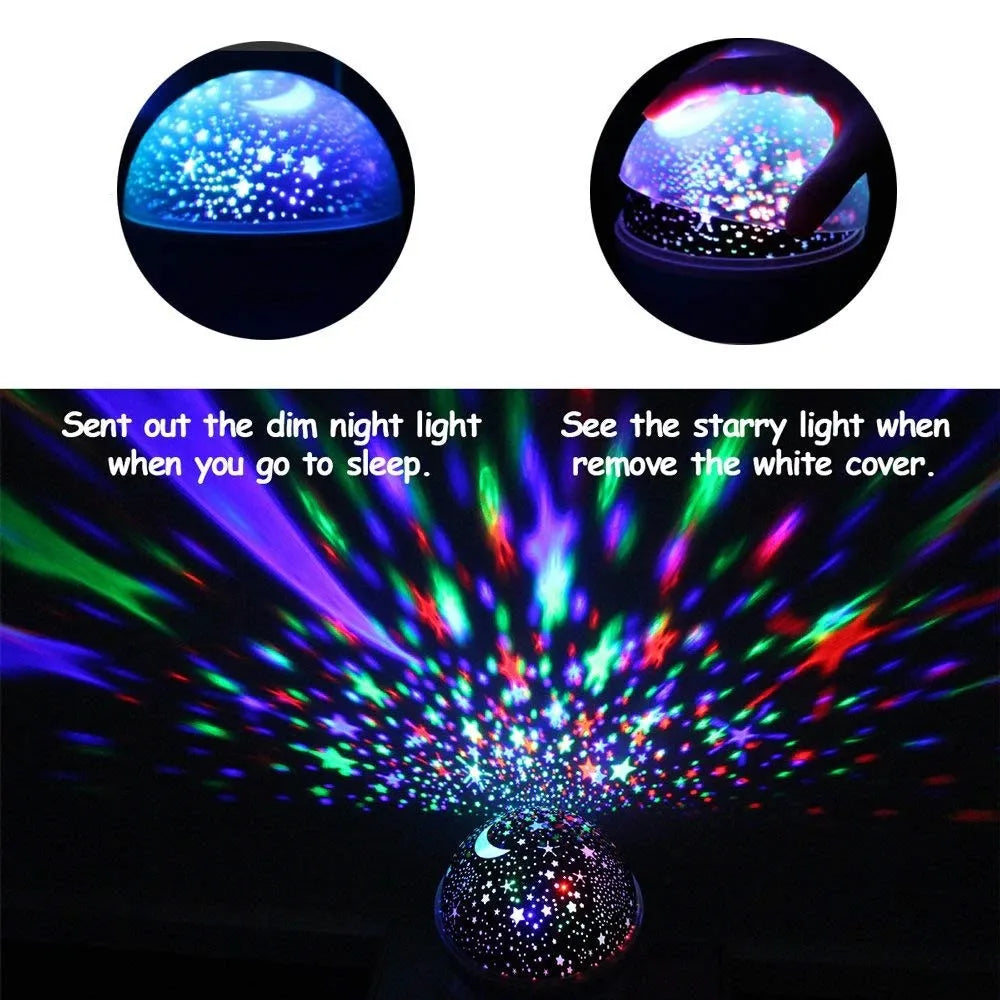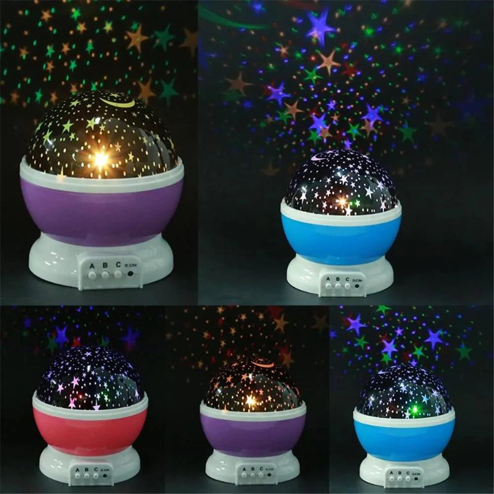 Create a magical bedtime atmosphere with the LED Rotating Night Light Projector, a compact and versatile lamp perfect for children's rooms. This multifunctional projector features soothing rotating star and moon patterns that gently spin to captivate and calm little ones, helping them relax and fall asleep easier.