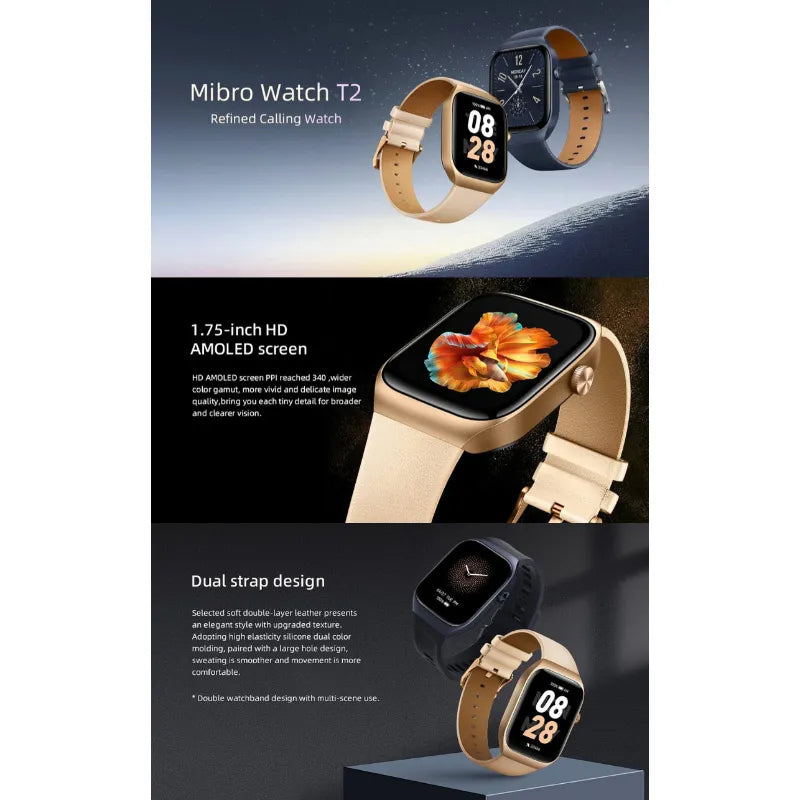 Experience next-level connectivity and fitness tracking with the Mibro T2 Dual-Core 2-in-1 Smartwatch, featuring a vibrant 1.75-inch HD AMOLED display (390x450 resolution) and advanced GPS satellite positioning (GPS/Beidou/GLONASS/Galileo/QZSS). Powered by Bluetooth 5.3 and a tri-magnetic speaker with anti-interference microphone, this 2ATM waterproof smartwatch supports Bluetooth calling, 105 sport modes, and up to 10 days of battery life. Includes dual straps (leather + silicone) for style versatility and seamless integration with the Mibro Fit app in 35 languages.