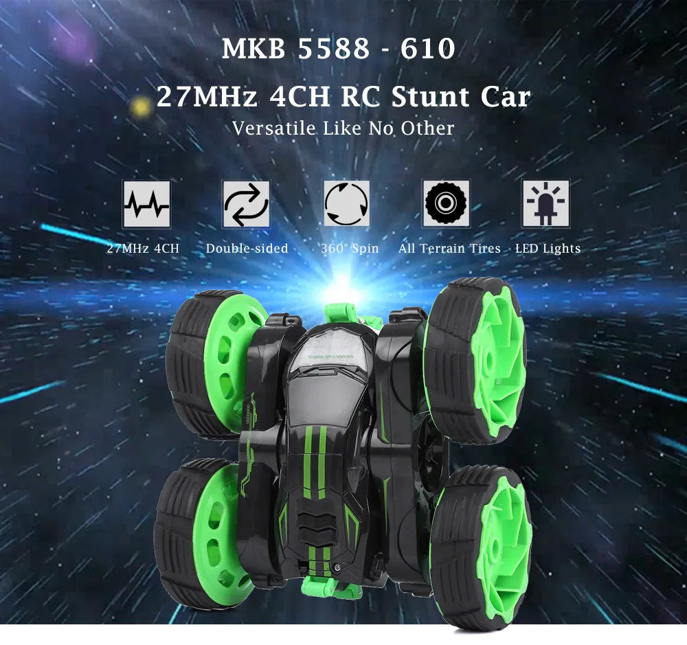 Unleash insane stunts with the MKB 5588-610 Climbing RC Car – a double-sided, all-terrain beast that defies gravity! This 4-channel 27MHz stunt monster features 360° rotation, 360° transformation, and powerful off-road climbing ability. Thanks to its unique dual-side design and independently rotating wheel arms, it can flip, spin, drive upside-down, and recover instantly from falls. Bright LED headlights light up the action, while the aerodynamic body and robust lateral supports ensure maximum durability. Powered by a rechargeable 6.4V 400mAh lithium-ion battery, it delivers 25–30 minutes of non-stop stunt performance with a control range of up to 10 meters. Perfect for kids and RC enthusiasts who crave extreme fun!