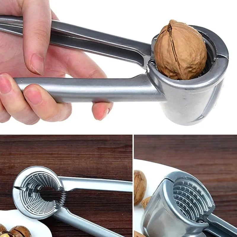 Crack nuts effortlessly and open bottles with ease using this Multifunction Durable Heavy Duty Walnut Opener. Crafted from high-quality stainless steel with a sturdy zinc alloy core, this silver-finished tool features a V-shaped funnel design that prevents shell debris from splashing. The spring-loaded mechanism requires minimal effort to crack walnuts, hazelnuts, hickory nuts, and other hard-shelled dried fruits (diameters 2–4.5 cm). Dual-purpose design also functions as a bottle opener for screw caps and crown corks. Non-slip, partly rubberized handles provide a secure, comfortable grip, while the heavy, robust construction ensures long-lasting performance. Perfect for home kitchens, catering, or gifting—simple, convenient, and suitable for all ages.