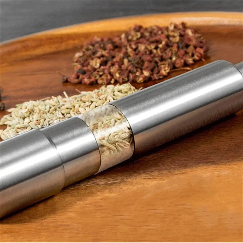 Simplify seasoning with the One-Handed Operation Thumb Push Stainless Steel Spice Grinder, a sleek, high-quality manual mill designed for effortless one-handed use. Crafted from food-safe stainless steel with a durable acrylic body, this grinder combines rust resistance, longevity, and a modern silver finish that complements any kitchen. The innovative thumb-press mechanism activates the grinder with a simple push—no twisting or two-handed operation required—making it ideal for busy cooks, BBQ grilling, camping, hosting, or everyday meal prep. The adjustable flow control ensures precise, mess-free dispensing so you can season dishes perfectly every time. The transparent window lets you monitor spice levels at a glance, while the generous internal capacity holds plenty of peppercorns, sea salt, dried herbs, or other spices. Compact yet powerful (14.4 x 2.7cm approx), it fits comfortably in one hand and is easy to store or carry. No batteries needed, eco-friendly, and built to last with sharp, long-lasting grinding rods, this grinder is perfect for home cooks, restaurant owners, or anyone who loves perfectly seasoned food.