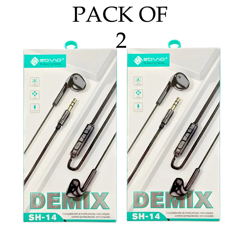 Elevate your audio experience with the Pack of 2 SOVO SH-14 DEMIX Stereo Sound Handsfree, designed for crystal-clear music playback, immersive gaming, and professional video conferencing. These wired in-ear earphones deliver rich stereo sound with deep bass, clear mids, and crisp highs through premium drivers, while the built-in HD microphone with advanced call noise reduction ensures stable and clear conversations even in noisy environments.