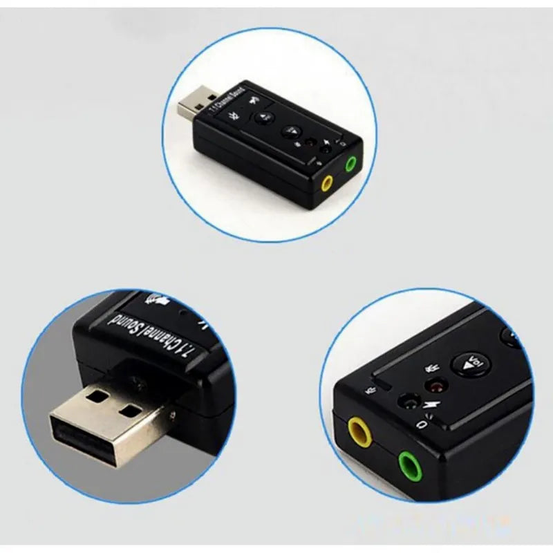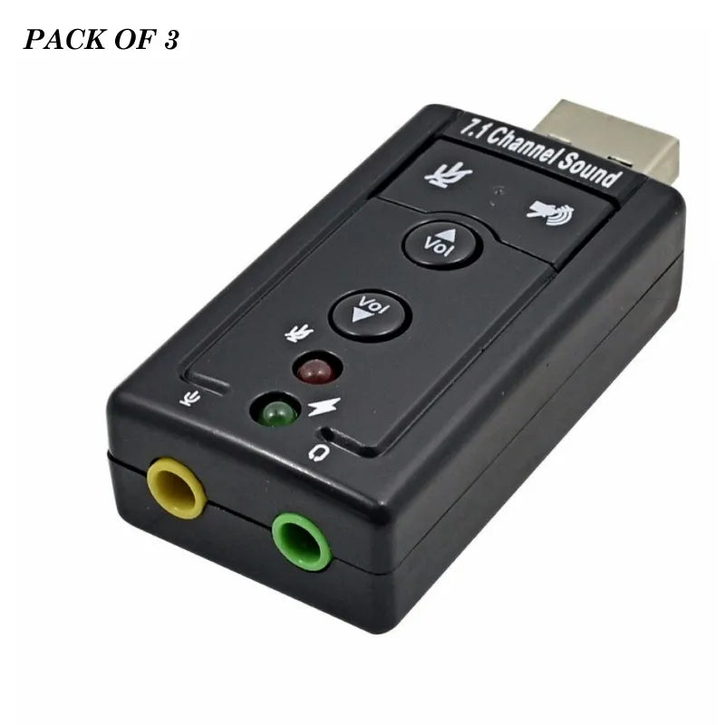 Enhance your audio setup instantly with the Pack of 3 Mini External USB 7.1 Channel 3D Audio Sound Card Adapters, perfect for PCs and notebooks. These compact, USB-powered adapters transform stereo output into immersive 7.1-channel surround sound, ideal for gaming, music, movies, and video calls. Featuring LED indicators, function keys, and plug-and-play compatibility, each adapter supports both headphone output and microphone input via standard 3.5mm jacks—no external power required.