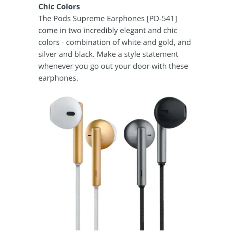 Elevate your audio experience with the PD-541 Supreme In-Ear Earphones, the latest addition to the Pods Supreme series. Designed for audiophiles and style-conscious users, these earphones deliver exceptional sound quality with deep bass, clear mids, and crisp highs. Featuring an in-built microphone, remote control, and a durable silicon-coated cable, the PD-541 offers both functionality and flair, making it ideal for music, calls, and on-the-go lifestyles.