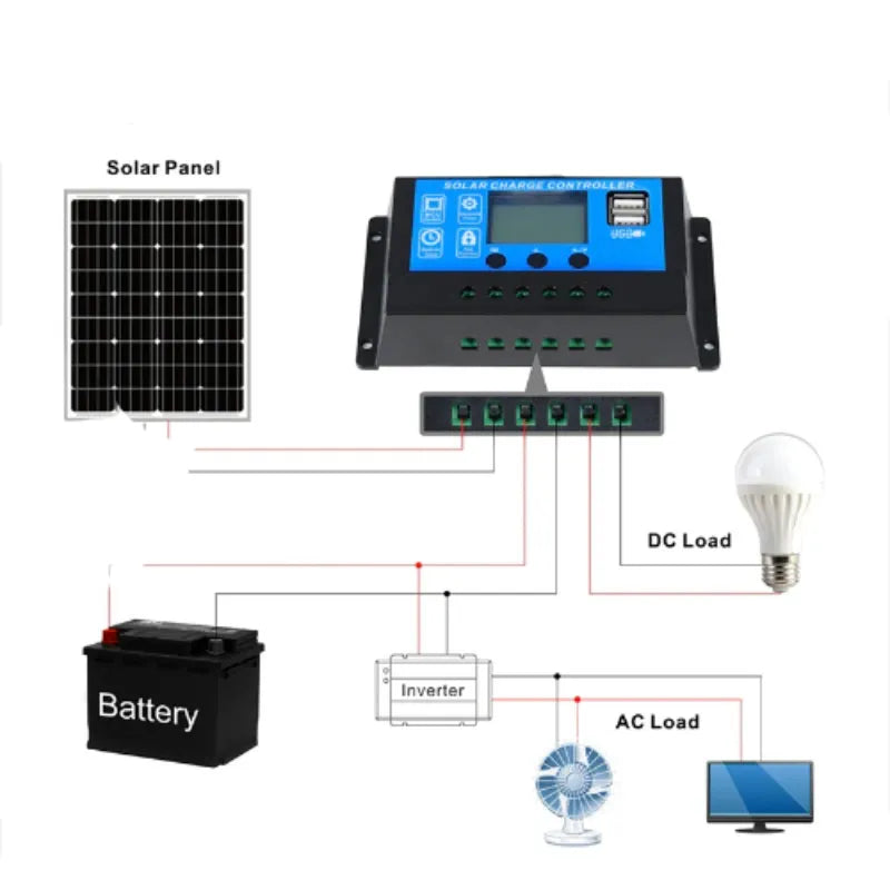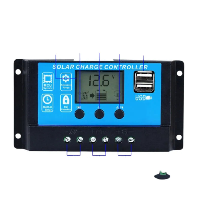 Protect your batteries and maximize solar power with this intelligent 60A PWM Solar Charge Controller! Featuring a large clear LCD display and fully automatic 12V/24V detection, it supports Lead-Acid, GEL, Flooded, and Lithium LiFePO4 batteries. Advanced 4-stage PWM charging plus multiple protections (short circuit, reverse polarity, overload, overcharge) ensure safe and efficient charging. Dual USB 5V/3A ports let you charge phones and tablets directly. Perfect for off-grid solar systems, cabins, RVs, boats, and home backup power.