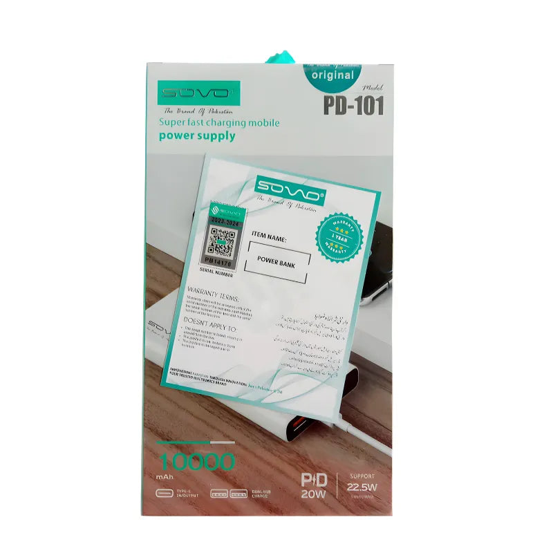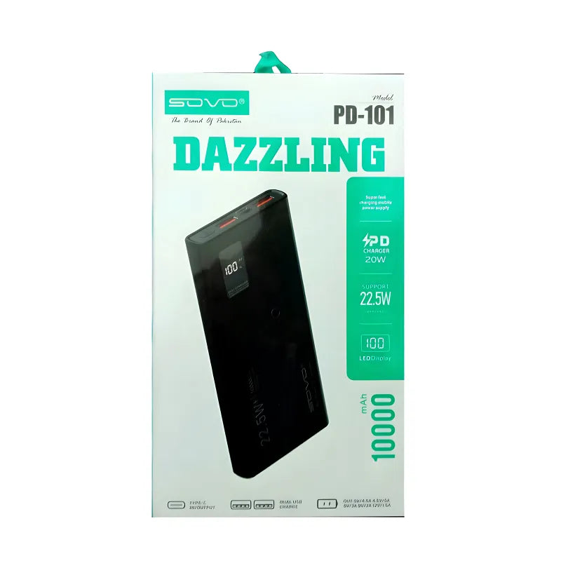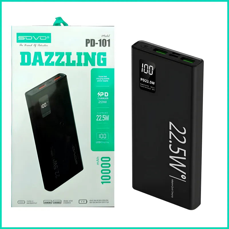 Power up fast with the SOVO PD-101 Dazzling 10000mAh Portable Charger — featuring 22.5W supercharge, 20W PD (Power Delivery), and LED digital display for real-time battery status. Dual USB-A + Type-C ports support simultaneous charging of two devices. Includes built-in flashlight, overcharge/short-circuit/overheat protection, and compact, durable ABS build. Charges iPhone 14 ~2.5 times, Samsung ~2 times. Compatible with phones, tablets, earbuds, and more. Random color (White/Black) shipped.
