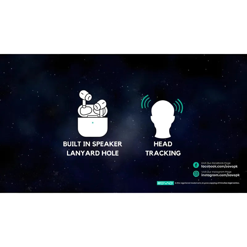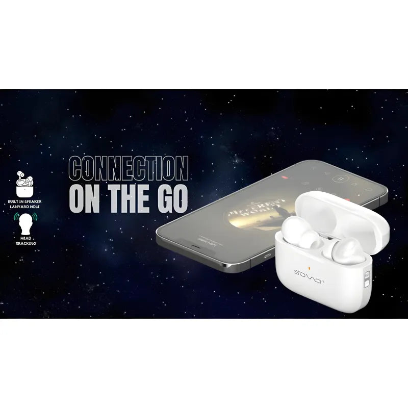 Experience next-level audio freedom with the SOVO SBT-920 Ultra Pro+ True Wireless AirPods, engineered for high-fidelity sound, seamless connectivity, and all-day comfort. Powered by Bluetooth V5.3, these premium white earbuds deliver rich bass, crystal-clear highs, and intelligent features like head tracking, touch controls, and ambient sound mode. With a total playtime of up to 25 hours (including charging case), built-in noise isolation, and a lanyard hole for secure portability, the SBT-920 is perfect for music lovers, commuters, and active users. Lightweight ABS construction ensures durability and all-day wearability.