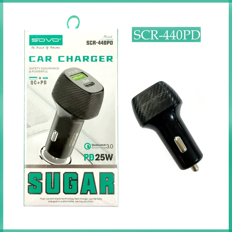 Power up your devices on the go with the SOVO SCR-440PD Sugar 25W PD Quick Charge Car Charger. This compact, dual-port car charger combines 25W Power Delivery (PD) and Qualcomm Quick Charge 3.0 technology for ultra-fast charging of smartphones, tablets, and other USB-C devices. With one USB-A and one USB-C port, it allows simultaneous charging of two devices at high speed. Built with fire-resistant ABS material, intelligent current matching, and multiple safety protections, it ensures safe, efficient charging even during long drives. The sleek black design fits all standard car cigarette lighter sockets (12-32V). Ideal for daily commutes, road trips, or family travel in Pakistan.