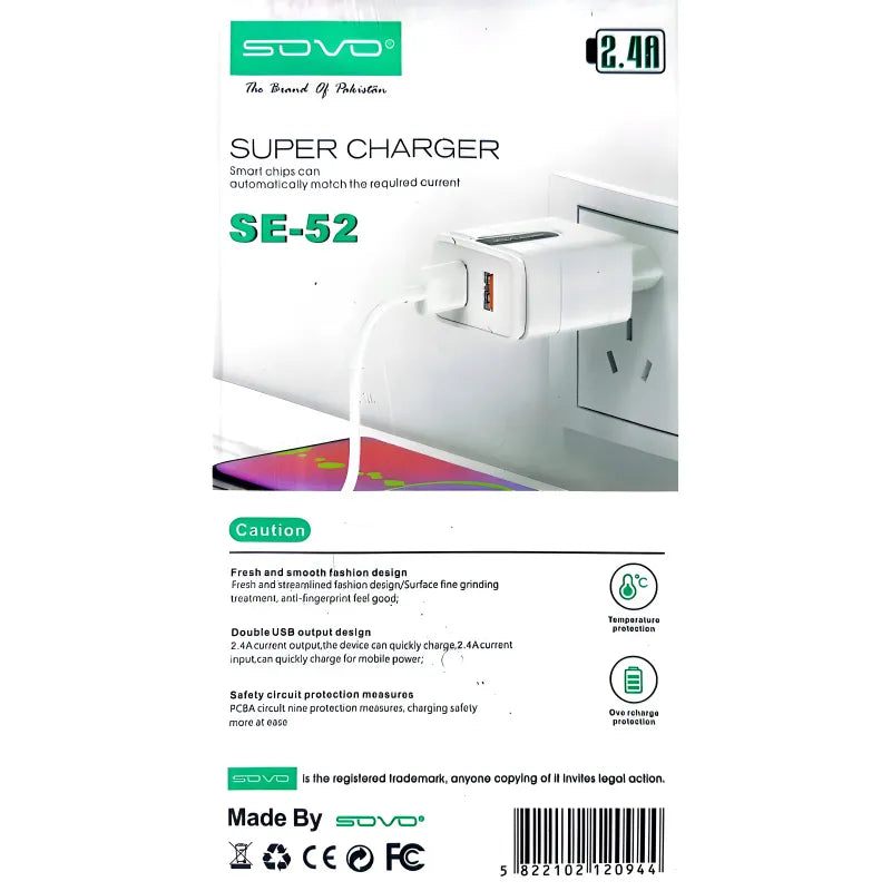 Power up quickly and safely with the SOVO SE-52 Lexus 2.4 Amp Dual USB Wall Charger, a high-performance adapter designed for efficient charging of smartphones, tablets, and other USB-powered devices. Featuring two USB ports with a combined 2.4A output (up to 3A max), this compact black charger supports fast charging and smart power distribution. Built with premium fire-resistant ABS material, it includes multi-layer safety protection against overcurrent, overvoltage, short-circuit, and overheating. The universal AC 100-240V input ensures global compatibility, making it ideal for home, office, or travel use.