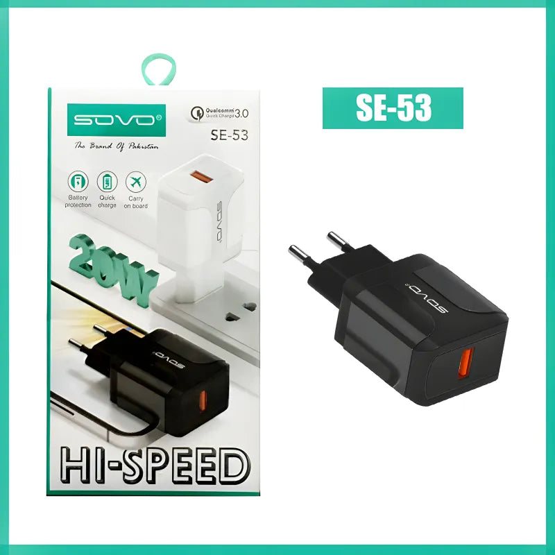 Charge faster and safer with the SOVO SE-53 Hi-Speed 20W Quick Charge Adapter, a premium single-port wall charger built for modern devices. Delivering up to 20W via USB Power Delivery (PD), it rapidly powers iPhones, Android phones, tablets, and more with intelligent voltage optimization. Crafted from fire-resistant ABS, this compact black adapter includes multi-layer safety protection against overcurrent, overvoltage, short-circuit, and overheating. Its global AC 100–240V input ensures worldwide compatibility, making it perfect for home, office, or travel. The sleek, lightweight design fits easily in any bag or pocket.
