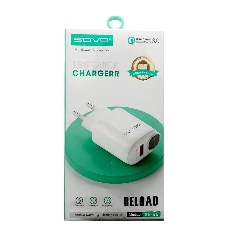 Charge smarter and faster with the SOVO SE-55 Reload 18W High-Quality Quick Charger — a compact, Qualcomm Quick Charge 3.0 certified wall adapter delivering up to 4x faster charging than standard 5W chargers. Features intelligent device detection, multi-layer safety protection (overcurrent, overvoltage, short-circuit, temperature control), and durable ABS construction. Universal USB-A output works with Android, iPhone, tablets, earbuds, and more. Ideal for home, office, or travel. Random color (White/Black) shipped.