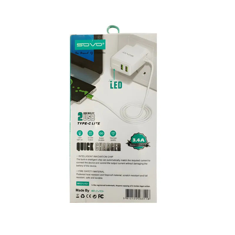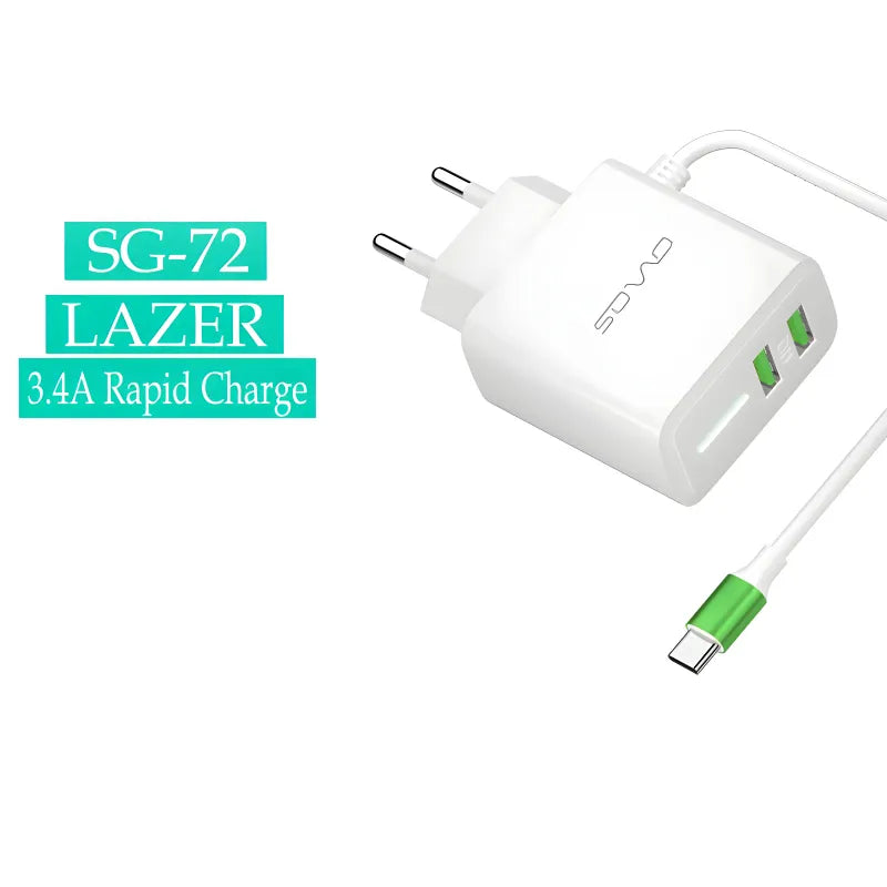 1 × SOVO SG-72 Lazer 3.4A Dual USB Fast Charger with Built-in Type-C Cable