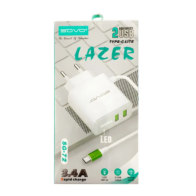 SOVO SG-72 Lazer 3.4A Dual USB Fast Charger with Type-C Cable & LED Light