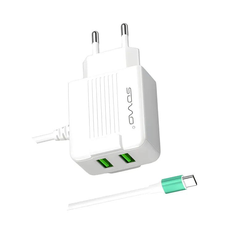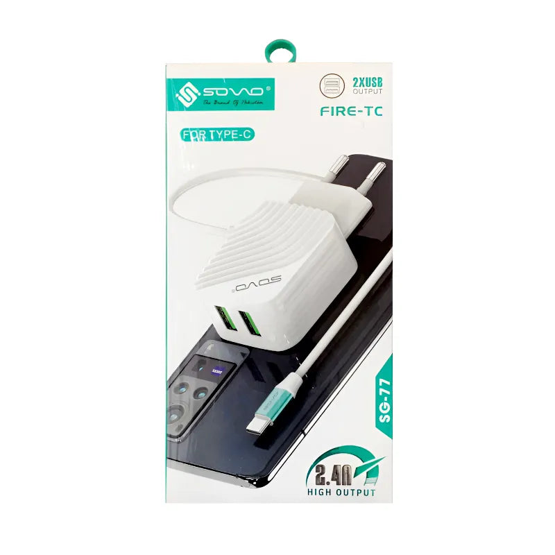 Charge your devices quickly and safely with the SOVO SG-77 FIRE-TC 2.4A High-Quality Type-C Charger. This smart wall charger features a permanently attached Type-C cable plus an extra USB-A port for simultaneous charging of two devices at up to 2.4A total output (max 2.4A per port), making it ideal for phones, tablets, earbuds, power banks, and accessories.