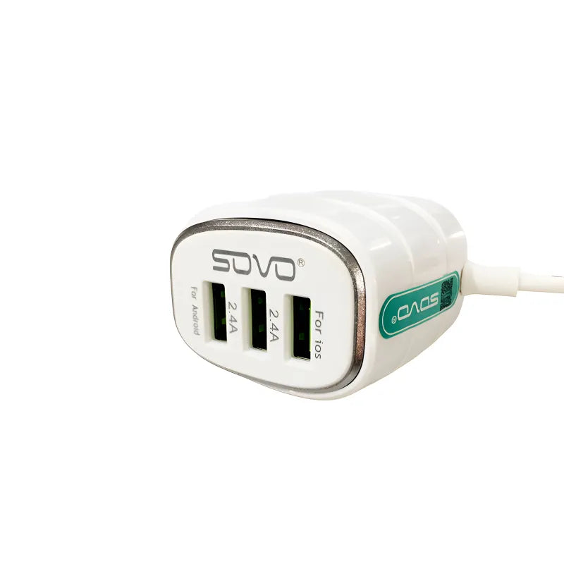 Power multiple devices quickly and safely with the SOVO SG-81 MAGIC 3.1A High-Quality Triple USB Charger. This smart wall charger features a permanently attached Micro USB cable plus two additional USB-A ports, delivering a total output of 3.1A (max 2.4A per port) for fast charging of smartphones, tablets, power banks, earbuds, and accessories.