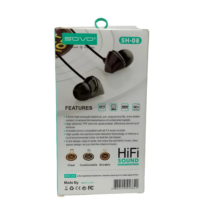 Enjoy rich, immersive audio with the SOVO SH-08 Warm-X 3.5mm Wired Handsfree — a compact, lightweight in-ear headset delivering Hi-Fi stereo sound, crystal-clear calls, and deep bass. Featuring gold-plated 3.5mm jack for stable, lossless signal and high-elasticity TPE cable to prevent breakage, it’s built for daily durability. The built-in HD microphone with noise reduction ensures clear voice pickup even in noisy environments. Includes 3 sizes of soft silicone ear tips for a secure, comfortable fit. Universal compatibility with all 3.5mm devices — phones, tablets, MP3/MP4, laptops, and PCs.