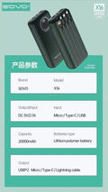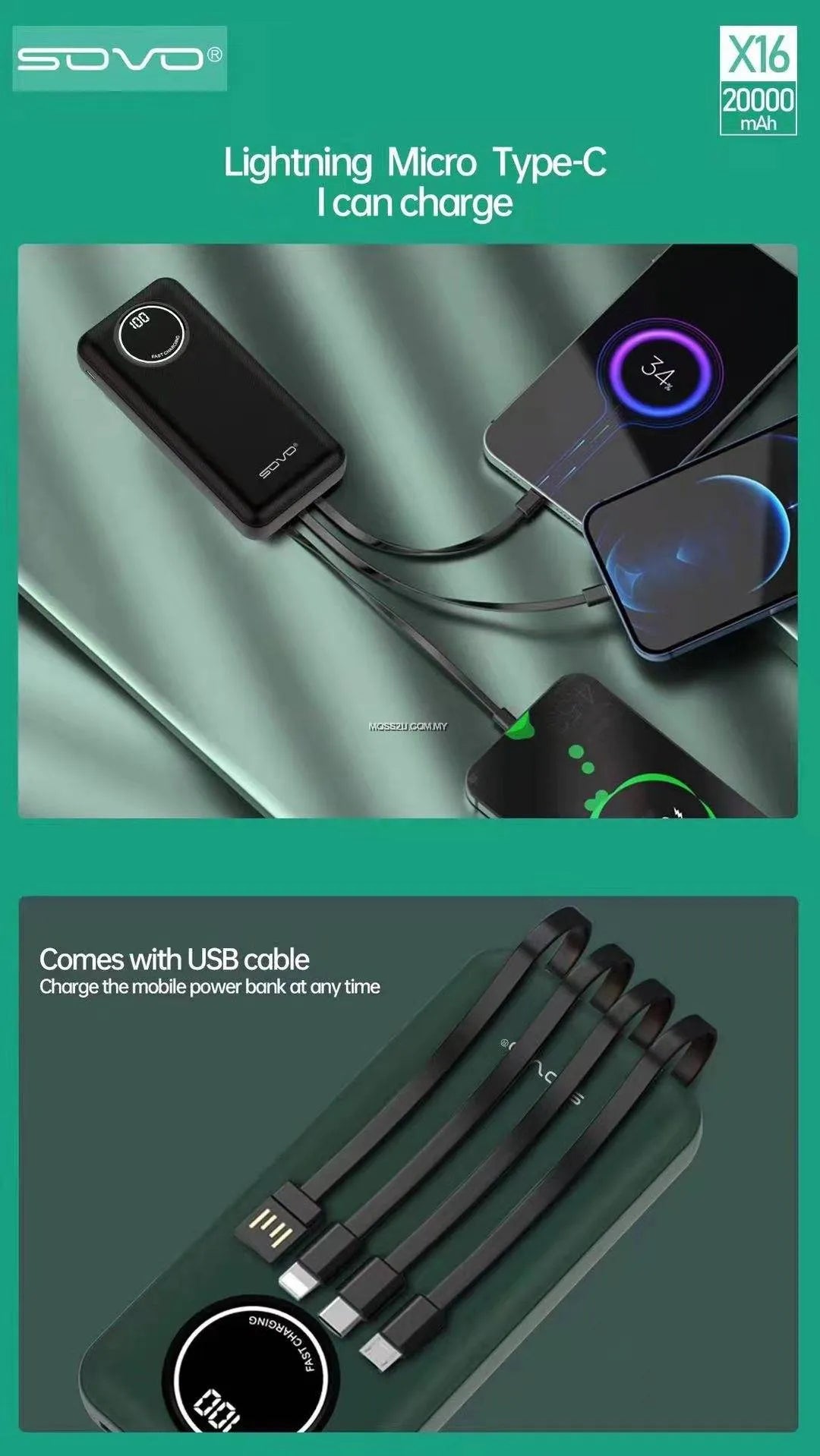 SOVO X16 20000mAh Power Bank with Built-In Cables and LED Display
