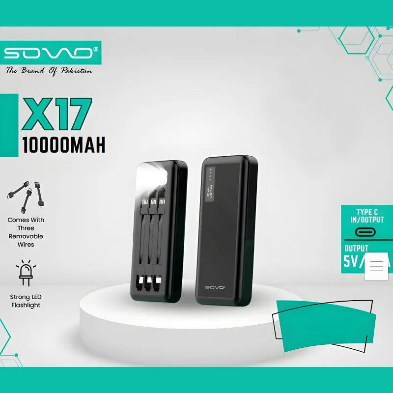 Stay powered anywhere with the SOVO X17 10000mAh Portable Power Bank — featuring built-in Lightning, Type-C, and Micro USB cables for instant charging without extra cords. Delivers fast 2.1A output to charge phones, tablets, and accessories quickly. Includes bright LED flashlight, smart digital display, and multiple safety protections (overcharge, over-discharge, short-circuit, overvoltage). The compact ABS design ensures portability and durability. Universal compatibility with iPhone, Samsung, Xiaomi, earbuds, and more. Random color (White/Black) shipped.
