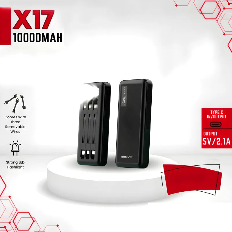 SOVO X17 10000mAh Power Bank with Built In 3 Cables Lightning Type-C Micro USB LED Flashlight
