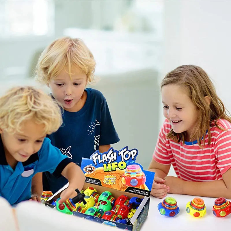 Light up the fun with this exciting 12 Piece UFO Spinning Tops Set! Each colorful top features bright LED lights, flashing patterns, and cheerful music that activate on spin. Simply insert the launcher, pull the ripcord, and watch them whirl, glow, and play tunes for minutes! Perfect for parties, classroom rewards, goodie bags, or just everyday play. Made from safe, durable plastic, these spinning UFOs are guaranteed to be a hit with kids aged 6+.