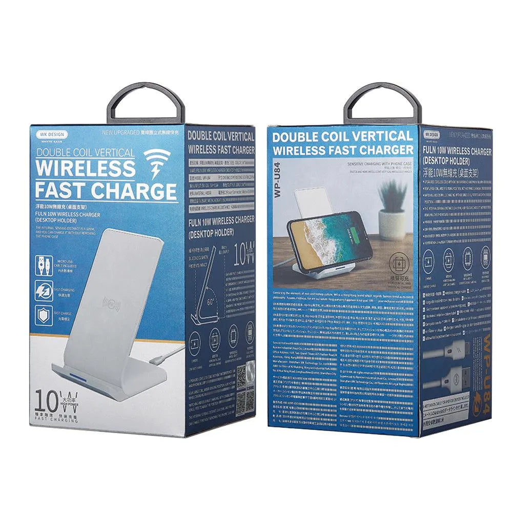 The WK WP-U84 10W Wireless Fast Charger combines high-speed wireless charging with versatile phone stand functionality, offering both vertical and horizontal positioning for optimal viewing while charging. This premium aluminum alloy charger features advanced dual-coil technology and Qualcomm Quick Charge 2.0 for efficient and safe charging of compatible smartphones.